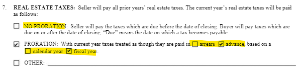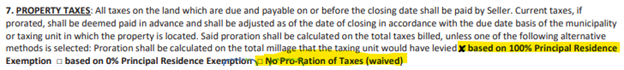 This Property tax paragraph shows based on 100% principal residence exemption, that may not be the case and could cost your client tax prorations. The other is No Prorations of taxes, that would also cost your client their refund of tax prorations in a advance payable scenario, and opposite in a arrears payable scenario. No prorations of taxes can be a good deal making strategy. It could be a way to get more ‘seller concessions’ than what a lender might allow.