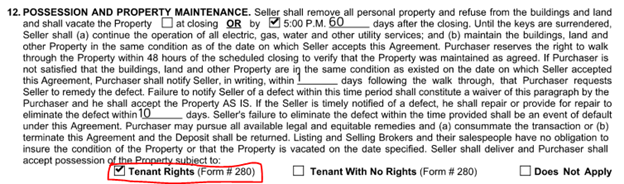 Properties Occupied by Tenants: Be cautious when writing a purchase agreement on a property that has a tenant occupying the home. Mistakes are often made on the PA with these types of deals. The contract might read that possession shall be delivered at the close or ‘X’ days after close. If a seller has a tenant in the home, those tenants have rights and the seller may not be able to deliver possession of the property according the contract. If you’re representing the seller, advise them of the risks, and make sure the PA terms are possible. If you’re representing the buyer, make sure they contact their attorney to understand tenant rights. Determine what the seller is able to do, and what the buyer wants to do. If the buyer wants the property delivered with no tenant rights, make sure to specify that on the purchase agreement. See this purchase agreement section that has “Tenant Rights” selected in the Possession section of the purchase agreement. These tenant rights clauses may show up on other segments of a purchase agreement but most often in the possession paragraph section. If youre listing a tenant occupied property make sure tenant rights are included on a purchase agreement accepted. If youre the selling agent make sure you specify if a property will or will not have tenant rights if a tenant is located in the home your buyer is offering on. It’s risky for a owner occupant buyer if they are buying a tenant occupied home with possession to the tenant after the closing. The tenant may not leave after the stipulated possession period which could cause your buyer many legal and occupancy issues. I encourage sellers of single family homes to remove tenants before listing to eliminate many buyer concerns which will cause many potential buyers to walk away, not to mention many tenants make it hard to show a home by declining showings and not keeping the home is ‘show’ ready condition.
